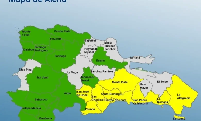 San Cristóbal, Santo Domingo, San Pedro de Macorís, La Altagracia y La Romana, mientras que Puerto Plata y San José de Ocoa se encuentran bajo aviso preventivo.